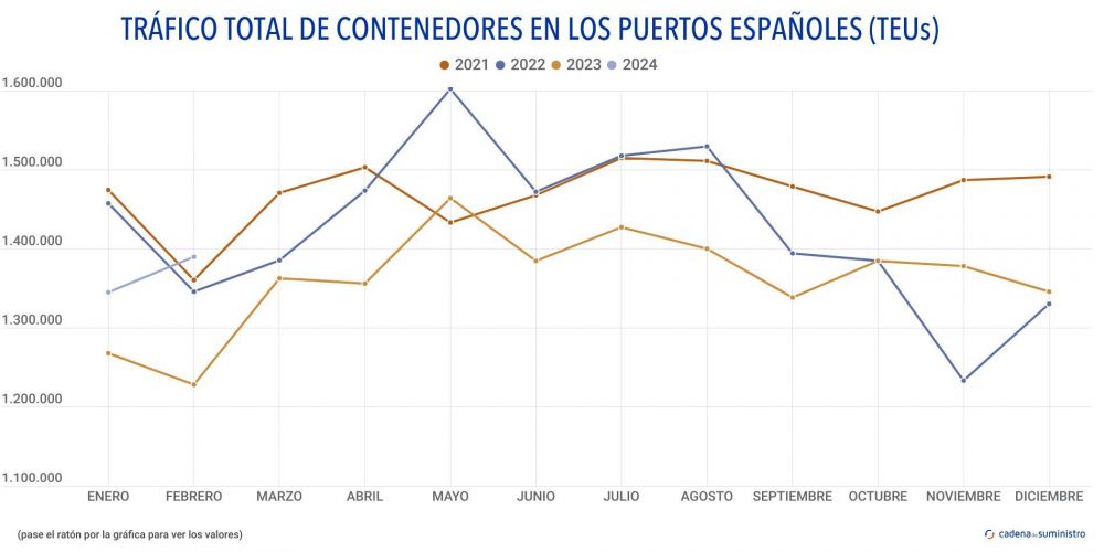 Durante el pasado mes de febrero, el sistema portuario español ha movido 1.389.626 TEUs, un 13,32% más que en el segundo mes del pasado 2023.