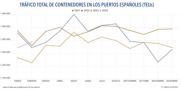 En detalle, 727.167 TEUs corresponden a contenedores en tránsito, un 20,46% anual más, mientras que 175.626 TEUs corresponden a entradas y salidas nacionales, un 10,8% más que en febrero de 2023, y 486.834 TEUs a import-export exterior, lo que se traduce en un ascenso anual de un 4,9%.